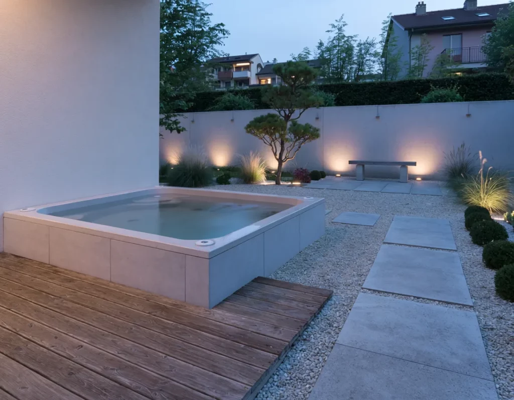 Le budget se situe généralement entre 15’000 et 45’000 CHF selon la taille et les finitions choisies. Les modèles encastrés avec margelles en pierre naturelle ou en bois exotique représentent l’investissement le plus important.